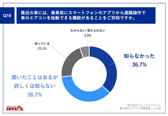 「Q10.最近の車には、乗車前にスマートフォンのアプリから遠隔操作で車のエアコンを始動できる機能があることをご存知ですか。」(n=109)と質問したところ、「知らなかった」が36.7%、「聞いたことはあるが詳しくは知らない」が36.7%という回答となりました。
