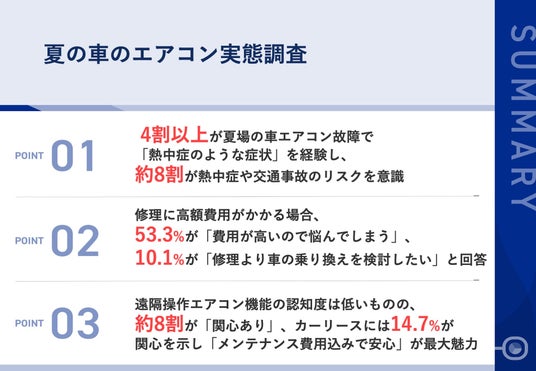- 01|4割以上が夏場の車エアコン故障で「熱中症のような症状」を経験し、約8割が熱中症や交通事故のリスクを意識