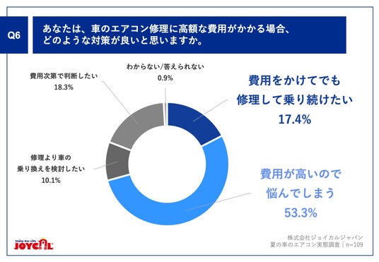 「Q6.あなたは、車のエアコン修理に高額な費用がかかる場合、どのような対策が良いと思いますか。」(n=109)と質問したところ、「費用が高いので悩んでしまう」が53.3%、「費用次第で判断したい」が18.3%という回答となりました。