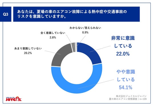 「Q3.あなたは、夏場の車のエアコン故障による熱中症や交通事故のリスクを意識していますか。」(n=109)と質問したところ、「非常に意識している」が22.0%、「やや意識している」が54.1%という回答となりました。