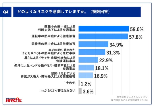 Q3で「非常に意識している」「やや意識している」と回答した方に、「Q4.どのようなリスクを意識していますか。(複数回答)」(n=83)と質問したところ、「運転中の熱中症による判断力低下による交通事故」が59.0%、「運転中の熱中症による健康被害」が57.8%、「同乗者の熱中症による健康被害」が34.9%という回答となりました。