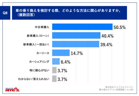 「Q8.車の乗り換えを検討する際、どのような方法に関心がありますか。(複数回答)」(n=109)と質問したところ、「中古車購入」が50.5%、「新車購入(ローン)」が40.4%、「新車購入(一括払い)」が39.4%という回答となりました。