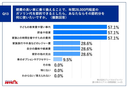 Q12で「燃費が向上する点」と回答した方に、「Q13.燃費の良い車に乗り換えることで、年間28,000円程度(※2)のガソリン代を節約できるとしたら、あなたならその節約分を何に使いたいですか。(複数回答)」(n=21)と質問したところ、「子どもの教育費や習い事代」が57.1%、「貯金や投資」が57.1%、「家族との時間を増やすための費用」が57.1%という回答となりました。