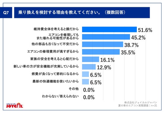Q6で「修理するより車の乗り換えを検討したい」「費用次第で判断したい」と回答した方に、「Q7.乗り換えを検討する理由を教えてください。(複数回答)」(n=31)と質問したところ、「維持費全体を考えると損だから」が51.6%、「エアコンを修理してもまた壊れる可能性があるから」が45.2%、「他の部品も古くなって不安だから」が38.7%という回答となりました。