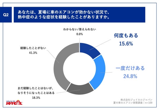 「Q2.あなたは、夏場に車のエアコンが効かない状況で、熱中症のような症状を経験したことがありますか。」(n=109)と質問したところ、「何度もある」が15.6%、「一度だけある」が24.8%という回答となりました。