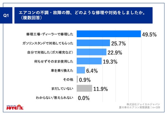 「Q1.エアコンの不調・故障の際、どのような修理や対処をしましたか。(複数回答)」(n=109)と質問したところ、「修理工場・ディーラーで修理した」が49.5%、「ガソリンスタンドで対処してもらった」が25.7%、「自分で対処した(ガス補充など)」が22.9%という回答となりました。
