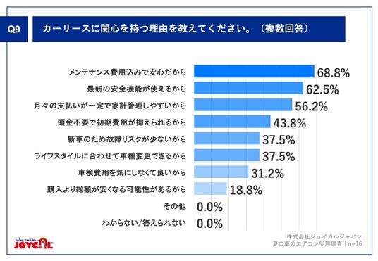 Q8で「カーリース」と回答した方に、「Q9.カーリースに関心を持つ理由を教えてください。(複数回答)」(n=16)と質問したところ、「メンテナンス費用込みで安心だから」が68.8%、「最新の安全機能が使えるから」が62.5%、「月々の支払いが一定で家計管理しやすいから」が56.2%という回答となりました。