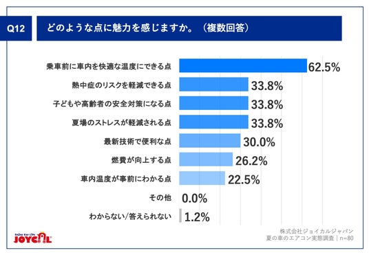 Q11で「非常に関心がある」「やや関心がある」と回答した方に、「Q12.どのような点に魅力を感じますか。(複数回答)」(n=80)と質問したところ、「乗車前に車内を快適な温度にできる点」が62.5%、「熱中症のリスクを軽減できる点」が33.8%、「子どもや高齢者の安全対策になる点」が33.8%、「夏場のストレスが軽減される点」33.8%という回答となりました。