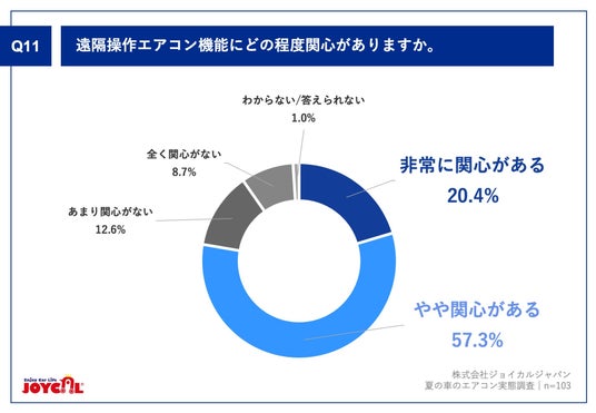 Q10で「わからない/答えられない」以外を回答した方に、「Q11.遠隔操作エアコン機能にどの程度関心がありますか。」(n=103)と質問したところ、「非常に関心がある」が20.4%、「やや関心がある」が57.3%という回答となりました。