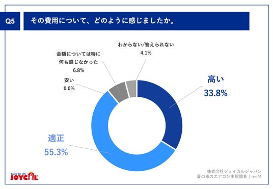 Q1で「修理工場・ディーラーで修理した」「ガソリンスタンドで対処してもらった」と回答した方に、「Q5.その費用について、どのように感じましたか。」(n=74)と質問したところ、「高い」が33.8%、「適正」が55.3%という回答となりました。