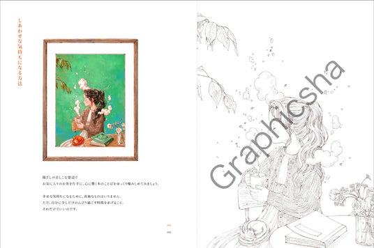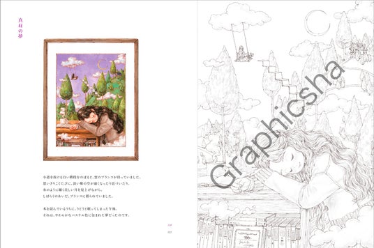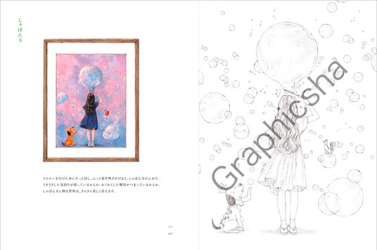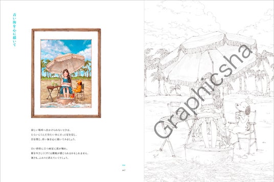 シャボン玉を吹きながら輝く風景に佇む姿、木陰で動物たちと静かな時間を過ごす姿、レースのパラソルの下でたらいの水に足をひたし、青い海へと想いを馳せる姿、日差し差し込む窓辺でお茶を片手にひと息つく姿…。さまざまなシーンのエポルを通して、色彩に心をゆだねることのできる一冊です。