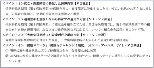 当社は、お客さまの万が一の備えに加え、毎日の健康を応援する「健康応援企業」をビジョンに掲げ、保険本来の役割(Insurance)と健康をサポートする機能(Healthcare)を組み合わせた「Insurhealth(R)(インシュアヘルス)」を、新たな価値として提供しています。今後、日本は超高齢化社会を迎え、平均寿命の延伸に伴う老後資金の不足が懸念されます。こうした不安を解消し、より幅広い世代のお客さまに変額保険をご提供することで、お客さまの健康で豊かな老後の実現を目指します。今回、以下の4点を主な特徴として、ニーズに応じたより幅広い選択肢をご提供できるようにしました。