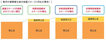本商品では、お客さまの喫煙状況・健康状態に応じて「健康ステージ」を適用します。お払込みいただく保険料は変更することなく、各健康ステージに応じて、健康積立金を毎月積立金に加算する仕組みです。健康積立金を含めて特別勘定で運用を行うため、「健康ステージ」を適用することで資産形成の効果を高めることができます。