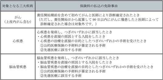 変額用保険料免除特約を付加した場合、第1保険期間(保険料払込期間)中に三大疾病により所定の事由に該当したとき、以後の保険料の払込が免除されます。 保険料の払込の免除事由該当後も、引き続き保険料の払い込みがあったものとして、保障や特別勘定による運用を継続することができます。
