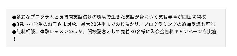 Kids Duoではネイティブティーチャーとバイリンガルティーチャーが常駐し、Arts&CraftやScienceなどのプログラムをオールイングリッシュで実施することで英語を「使える力」として自然に身につけていきます。また、年齢の異なる子どもたちが一緒に過ごす“無学年の集団”での活動を通じて、子どもたちのしあわせな未来を創る「自分力」「共創力」「想像力」の3つのチカラ※を育む環境を提供しています。年3回の保護者面談をはじめ、「定期連絡」や個別のフィードバックを実施することで、お子さまの成長を保護者さまへ定期的にレポートします。また、小学校からスクール、そしてスクールからご自宅周辺までの専用送迎バスや、最大20時半までの長時間預かりにも対応しており、忙しい保護者さまも安心してお預けいただくことができます。さらに Kids Duo松山東ではプログラミング教育 HALLO(R)を追加で受講でき、小学校で必修化のプログラミングスキルやプログラミング的思考も預けていただいている時間に身に付けることができます。子どもたちの未来を拡げるコンテンツがたくさん詰まっているKids Duo松山東。無料の説明会、体験レッスンでぜひ体感してください。