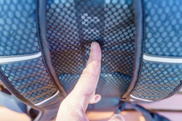 背面部分のパッドは立体成型でフィット感がよく、メッシュ生地とパッドの溝のおかげで背面の通気性も◎。