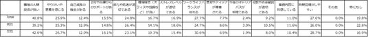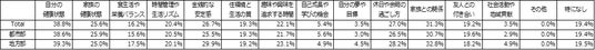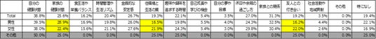 性別でみると、男女で上位の順位に大きな差はみられないものの、多くの項目で女性の数値の方が高いなか、男性の方が高かった項目は「家族との関係」「社会活動や地域貢献」「自己成長や学びの機会」「自分の夢や目標」だった。