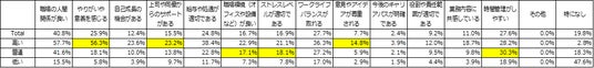 一方で、「やりがいや意義を感じる」「上司や同僚からのサポートがある」「意見やアイデアが尊重される」の3項目については、仕事の満足度・充実度が「普通」と回答した人と、「高い」と回答した人の間で割合が大きく異なった。