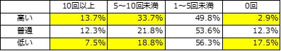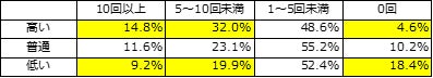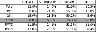 性別でみると、「5回以上」と回答した割合が女性では44.2%だったのに対し、男性は29.1%に留まり、大きな差がみられた。地域別では顕著な差はみられなかった。
