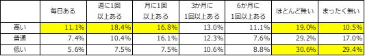 ■「仕事の満足度・充実度」(Q1)と「職場の人と仕事の内容以外で時間を共有する機会」(Q9)の関係を調べると、「仕事の満足度・充実度」が「高い」と回答した人のうち「月に1回以上ある」と回答した人は44.0%にのぼり、「ほとんど無い」「全く無い」と回答した人は、27.8%だった。一方、満足度が「低い」と回答した人では、「ほとんど無い」「まったく無い」と回答した人は58.7%にのぼり、顕著な差がみられた。