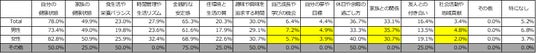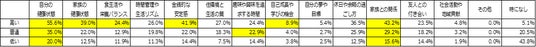 また、「低い」と回答した人と「普通」と回答した人を比べると「趣味や興味を追求する時間」の数値が大きく異なり、「普通」と回答した人と「高い」と回答した人を比べると「家族の健康状態」「金銭的な安定感」「食生活や栄養バランス」「自己成長や学びの機会」の数値が大きく異なった。(別紙Q6-2)