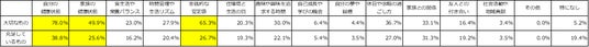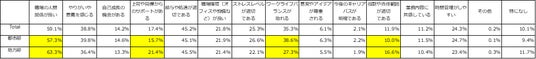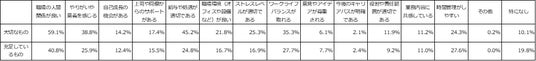 地域別では、都市部・地方部ともに1位から4位までの順位は変わらないが、4位の「ワークライフバランス」では都市部の方が11.3%pt高く、地域間で大きな差がついた。また、地方部に比べると都市部では「ワークライフバランスが取れる」が高く、都市部に比べると地方部では「職場の人間関係」「上司・同僚からのサポートがある」「役割・責任範囲が適切である」が高い結果となった。