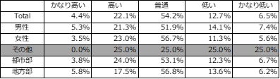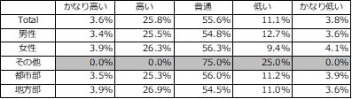 ■現在の生活における満足度・充実度を調査したところ、「かなり高い」「高い」の合計は29.4%、「普通」が55.6%、「低い」「かなり低い」の合計は14.9%だった。性別および地域別の数値に顕著な差はみられなかった。