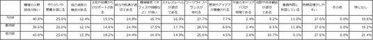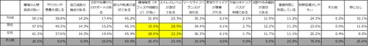 性別でみると、男女ともに1位から4位までは同様の結果だったが、5位に男性では「ストレスレベルが適切である」、女性では「職場環境が良い」が入っており、この2項目については男女の数値の差も大きかった。