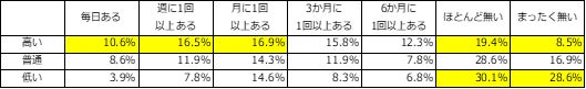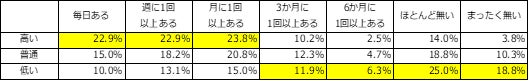 ■「生活の満足度・充実度」(Q4)と「職場の人と仕事の内容以外で時間を共有する機会」(Q9)の関係を調べると、「生活の満足度・充実度」が「高い」と回答した人のうち「月に1回以上ある」と回答した人は46.3%にのぼり、「ほとんど無い」「全く無い」と回答した人は、29.5%だった。一方、満足度が「低い」と回答した人では、「ほとんど無い」「まったく無い」と回答した人は60.0%にのぼり、「仕事の満足度・充実度」と比較したとき(Q9-1)と同様に顕著な差がみられた。