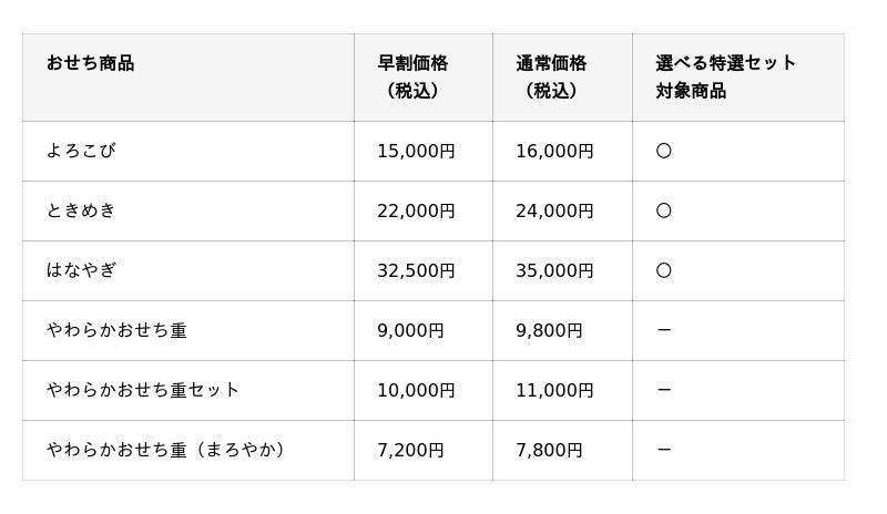 マンヨーケンおせち「よろこび」「ときめき」「はなやぎ」のおせちとセットで、お得にご購入いただける限定企画です。※特選セットのみの販売は承っておりません