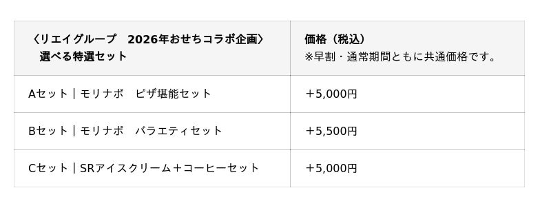 また、「リエイグループのコラボ企画」として、大人気冷凍ピザ「金沢ピザ工房 モリナポ(森山ナポリ)」や、スウェーデン・ストックホルム発のロースタリーカフェ「SR(ストックホルムロースト)」の商品をおせちとセットで楽しめる「選べる特選セット」を販売いたします※。