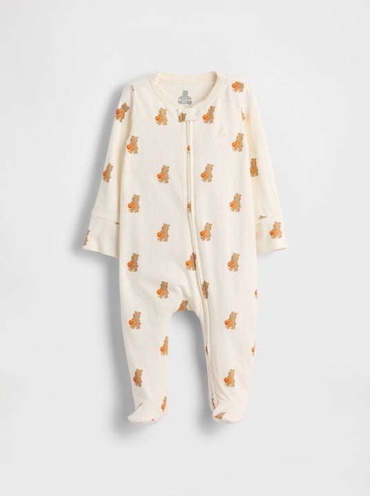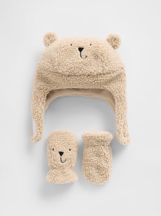 左から)ボディスーツ ¥2,990、オーガニックコットン 足つき カバーオール ¥4,990 (※50~65cm展開)、ボア ブラナンベア 帽子&ミトンセット ¥4,990 (※42~46cm展開)