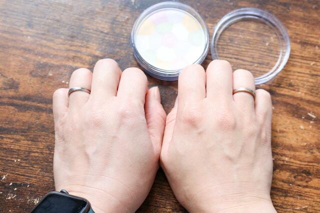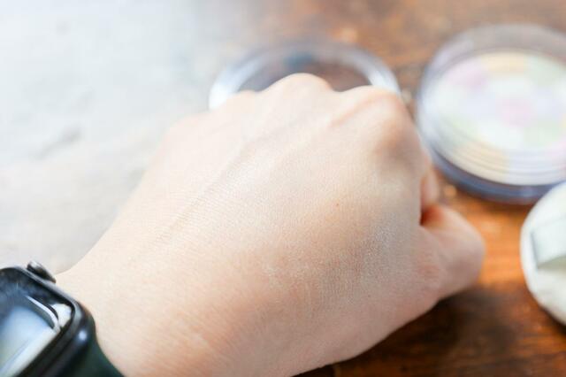 私が実践しているのが、手の甲に一度出して、余分な粉を落としてからつける方法です。