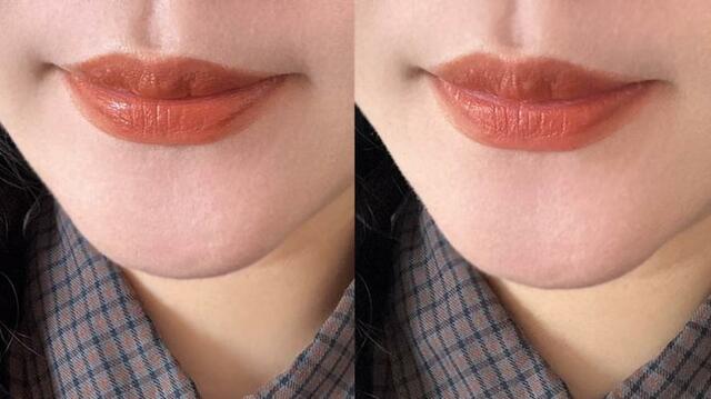 塗りたては適度にツヤがある、むっちりとした質感に。口紅ってものによっては唇の縦シワや乾燥が気になるものもありますが、それが少ないのも使いやすいポイントです。