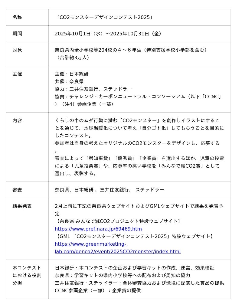 株式会社日本総合研究所(本社:東京都品川区、代表取締役社長:内川淳、以下「日本総研」)は、2025年3月4日付けで締結した「『みんなで減CO2(ゲンコツ)プロジェクト』による県民の脱炭素行動変容に関する連携協定」(以下「連携協定」)(注1)に基づき、奈良県(知事:山下真)と共催し、株式会社三井住友銀行(本社:東京都千代田区、頭取CEO:福留朗裕、以下「三井住友銀行」)とステッドラー日本株式会社(本社:東京都中央区、代表取締役社長:平野光応、以下「ステッドラー」)の協力を得て[暁金1] [も前2] 、奈良県内全小学校等204校の4~6年生(特別支援学校小学部を含む)合わせて約3万人を対象に、脱炭素行動を促す啓発コンテスト「CO2モンスターデザインコンテスト2025」(以下「本コンテスト」)を2025年10月1日(水)から10月31日(金)まで実施します。
