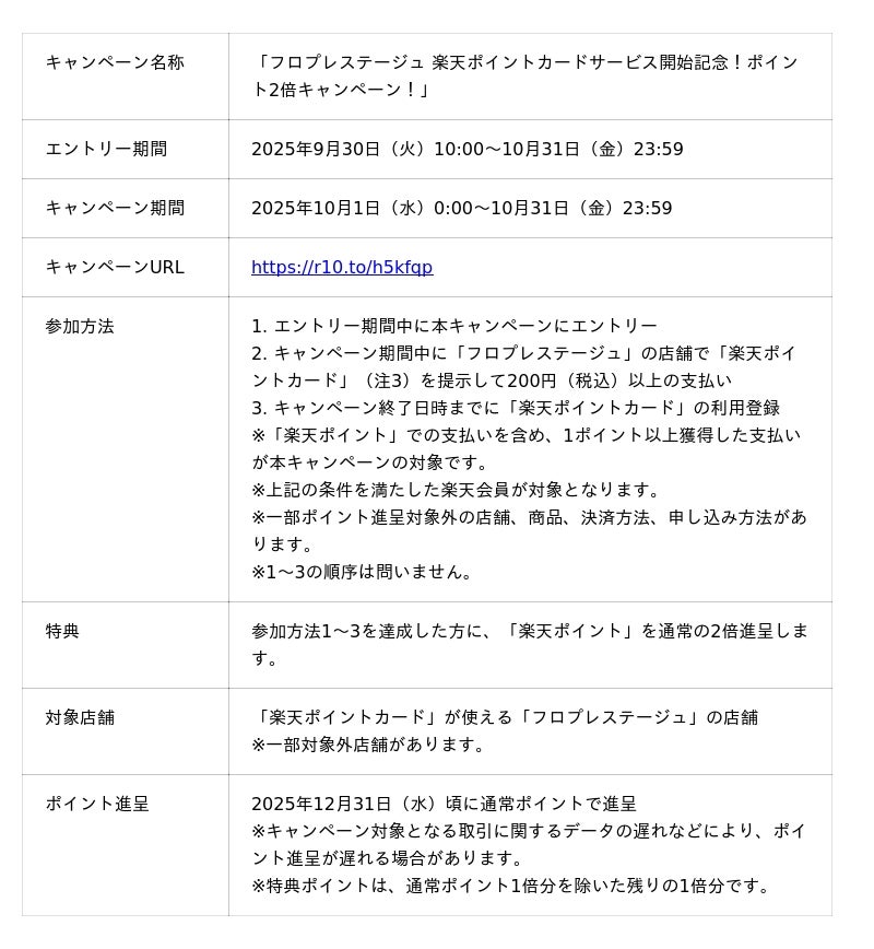 本導入を記念して、2025年10月1日(水)から10月31日(金)まで、「フロプレステージュ 楽天ポイントカードサービス開始記念!ポイント2倍キャンペーン!」を実施します。