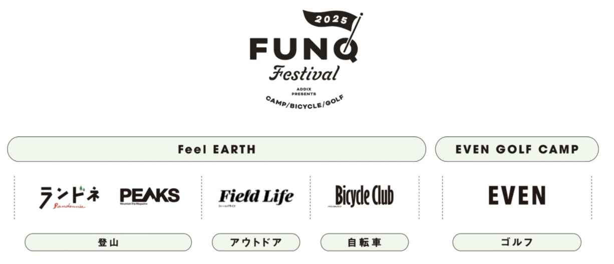 アクティブな趣味人のメディア『FUNQ』が企画・主催する『FUNQ Festival』は、“好き”をテーマにした新しい体験型イベントです。登山・アウトドア・自転車・ゴルフといった各分野で熱狂的な読者を抱える専門誌がコンテンツプロデュースを担い、趣味初心者からマニアまで楽しめるプログラムを展開します。今回開催した宿泊型ゴルフイベント「EVEN GOLF CAMP 2025」のほか、アウトドアキャンプイベント「Feel EARTH 2025 with Camp Jeep(https://www.funq.jp/feelearth2025/)」も同時開催しました。