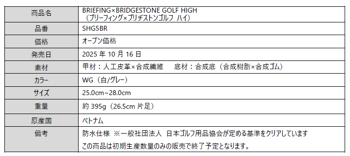 ブリヂストンスポーツ株式会社は、コンセプトに「URBAN GOLF」を掲げ、都会的なゴルフスタイルを提案する「BRIEFING GOLF」とコラボレーションした”CASUAL”スタイルのスパイクレスシューズ『BRIEFING×BRIDGESTONE GOLF HIGH』を10月16日に発売します。価格はオープンです。