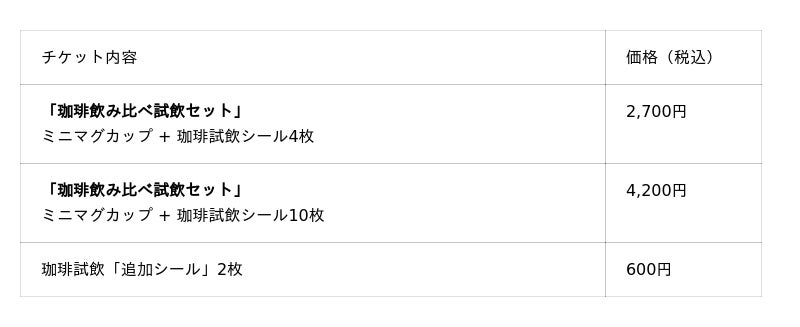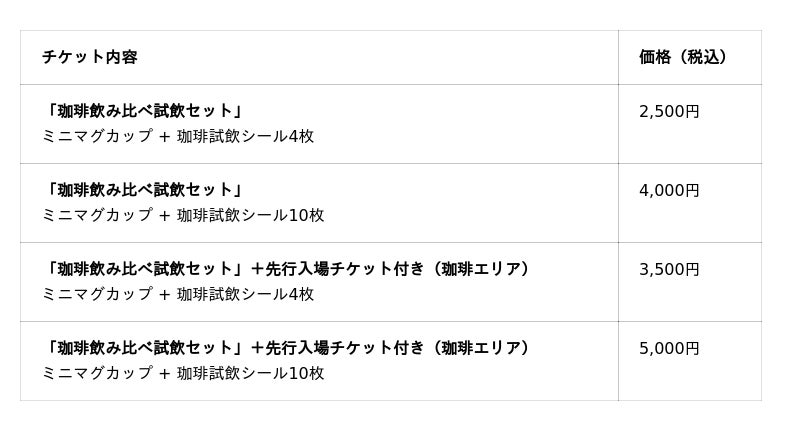 ※「先行入場チケット」は一般入場(9:30)より1時間早い(8:30)から珈琲エリアに入場できるプレミアチケットです。(台湾エリアの珈琲ブースは対象外となります。)