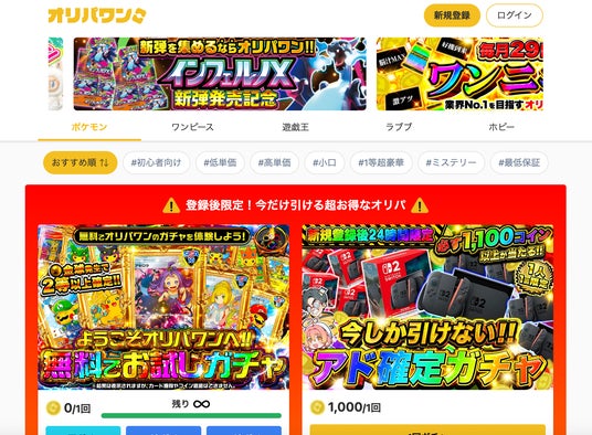 オンラインオリパサイト「オリパワン」は、新規登録者向け無料ガチャをリリース。今週も注目イベントが登場します。