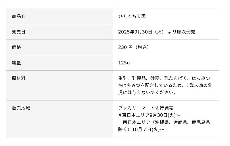古谷乳業株式会社(本社:千葉県千葉市/代表取締役社長:古谷裕彦/以下「古谷乳業」)と株式会社カヤック(本社:神奈川県鎌倉市、代表取締役CEO:柳澤大輔/以下「面白法人カヤック」)との共同企画第四弾として、生乳を50%以上使用したプロテインヨーグルト「ひとくち天国」(税込230円)を9月30日(火)より東日本エリア、10月7日(火)より西日本エリア(沖縄県、宮崎県、鹿児島県除く)のファミリーマートにて順次発売します。