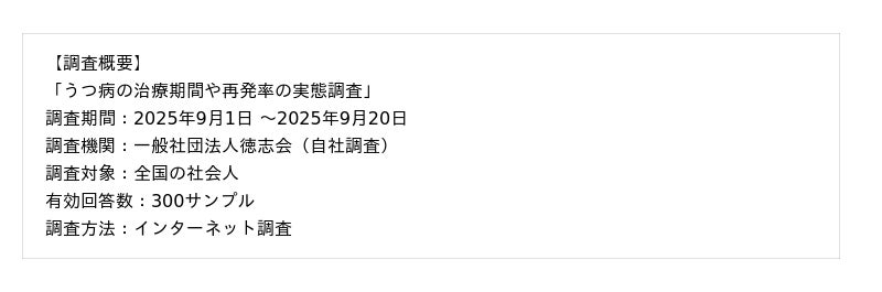 一般社団法人徳志会は、全国の社会人を対象にうつ病の治療期間や再発率に関するアンケート調査を実施しました。