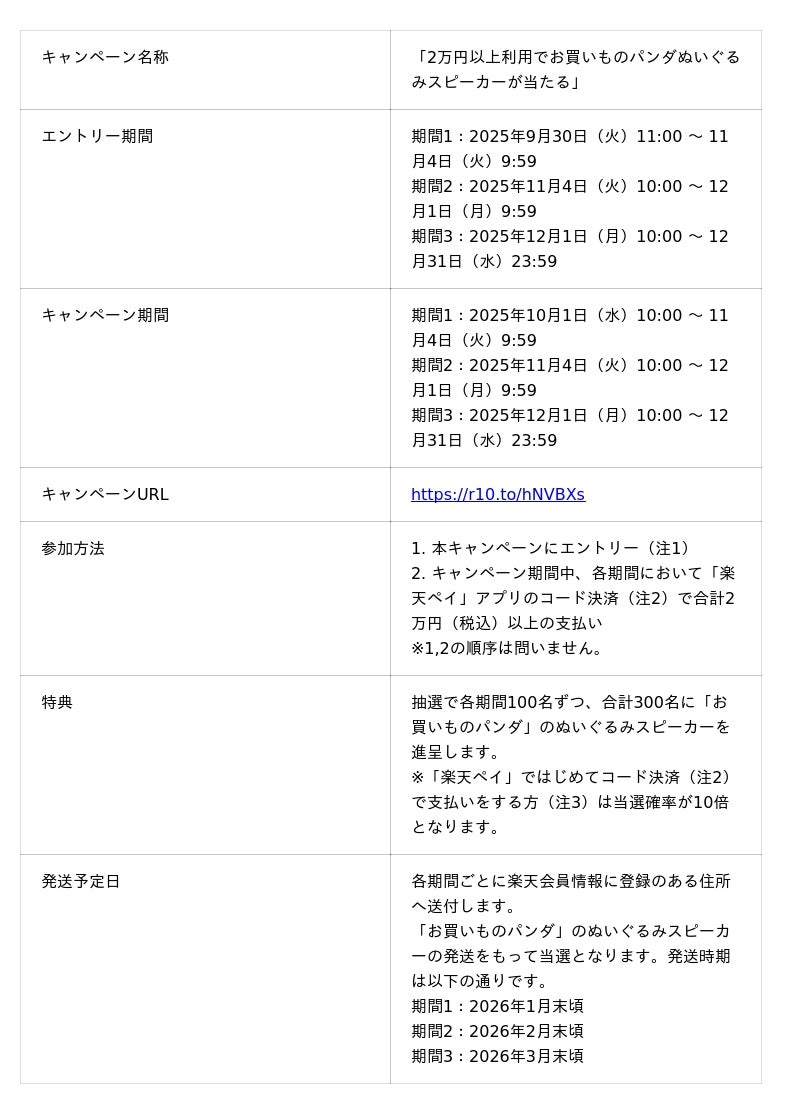 楽天ペイメント株式会社(以下「楽天ペイメント」)は、キャッシュレス決済サービス「楽天ペイ」において、楽天の公式キャラクター「お買いものパンダ」のぬいぐるみスピーカーが抽選で当たるキャンペーンを、2025年10月1日(水)から12月31日(水)まで実施することをお知らせします。