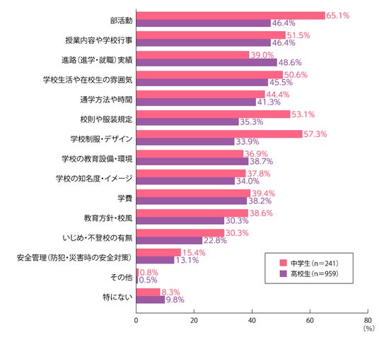 また、進学時に知りたい情報として、「部活動」「授業内容や学校行事」「進路実績」「学校生活や在校生の雰囲気」などが多くあげられています。中でも中学生は、「学校制服・デザイン」(57.3%)、「校則や服装規定」(53.1%)と、制服や服装に関する情報への関心が高いことが明らかになりました。