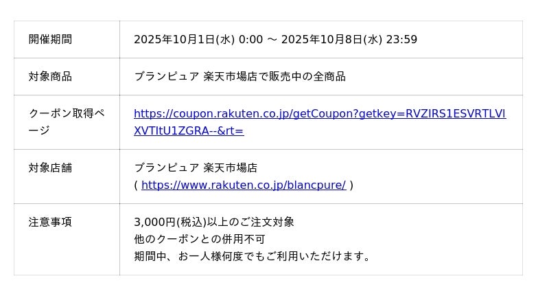 ピュアクリエイト株式会社(本社:埼玉県熊谷市)が運営するスキンケアブランド「BLANC PURE(ブランピュア)」は、2025年11月21日に設立3周年を迎えます。これを記念し、日頃のご愛顧への感謝を込めた特別企画として、ブランピュア楽天市場店にて販売する全品を対象とした「40%OFFクーポン」を、2025年10月1日(水)から10月8日(水)までの期間限定で配布いたします。