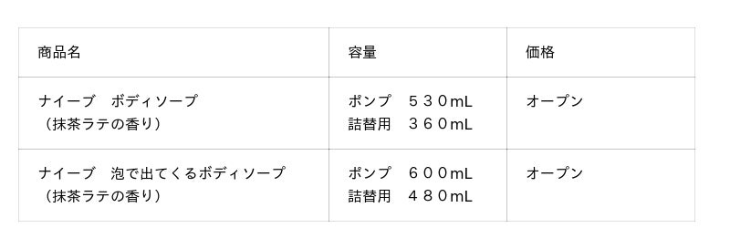 “家族みんなの肌を健やかに”というコンセプトのもと、人と家族を想い続けるブランド「ナイーブ」。この秋、「ナイーブ」として初めて「抹茶ラテの香り」のボディソープを発売致します。抹茶の深みのある香りとミルクのまろやかさが重なり合い、ふんわり甘く、気持ちもほっと温まる香りに仕上げました。「チャ葉エキス+ローヤルゼリー+グリセリン」(うるおい成分)配合で、しっとりなめらかな素肌に導きます。