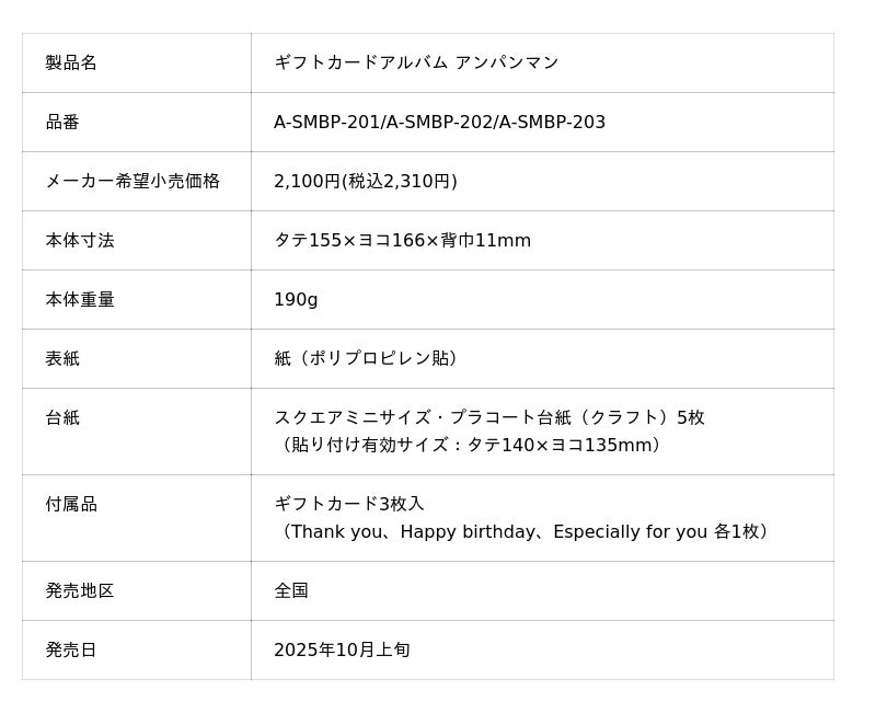 ナカバヤシ株式会社(本社:大阪市中央区、社長:中林一良)は子どもたちから愛され続ける「それいけ!アンパンマン」のイラストを使用したギフト向けアルバム「アンパンマンギフトアルバムシリーズ」2タイプ4品番を10月上旬より順次発売します。