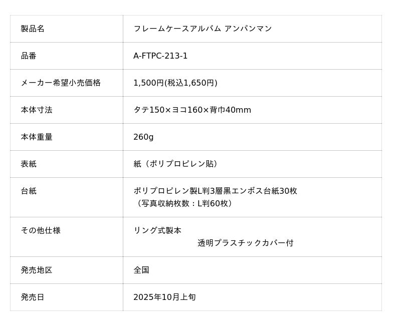 「フレームケースアルバム」は、台紙に入れた写真をめくって入れ替えることで簡単に好きな写真を飾ることができる人気のアルバムシリーズです。今回、アンパンマン柄がシリーズに追加されました。ケースには箔押し加工が施されており高級感があるので、お気に入りの写真やお子さまの写真を入れたギフトに最適です。