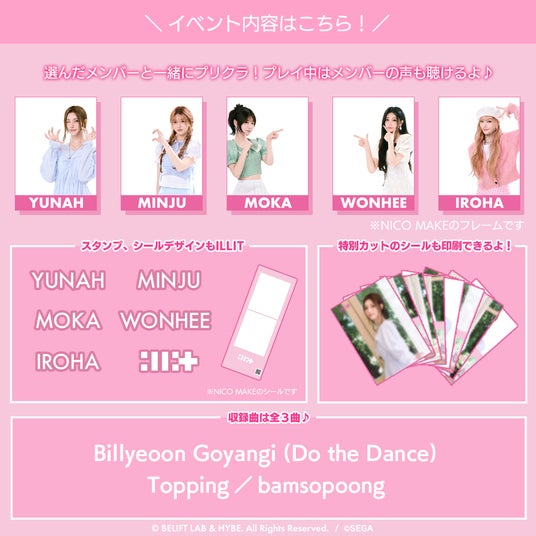 本イベントは全カット新規撮りおろしの撮影フレームやメンバーによるプリクラ専用ボイスにより、声を聴きながらメンバーとのプリクラ撮影が体験できる期間限定ILLITイベントです。さらにスタンプ、シールデザイン、楽曲などもILLIT仕様の豪華イベントモードとなっております。