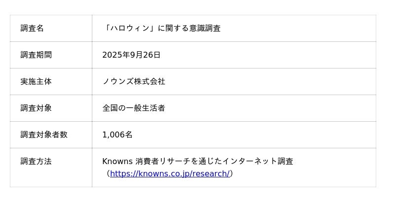 ノウンズ株式会社(本社:東京都渋谷区、代表取締役:田中啓志朗、以下「ノウンズ」)は、同社が提供する消費者意識データをリアルタイムで取得できるサブスク型リサーチSaaS「Knowns 消費者リサーチ」(https://knowns.co.jp/research/)を通じて、全国の一般生活者1,006名を対象に「ハロウィンに関する意識調査」を実施しました(調査期間:2025年9月26日)。